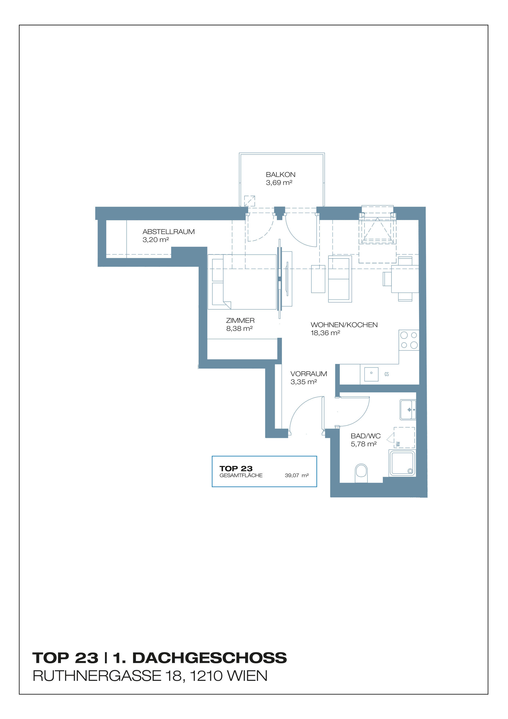Helle Räume und ein Balkon prägen dieses Apartment. Die zentrale Lage im Gebäude ermöglicht kurze Wege und einen hohen Wohnstandard im ersten Dachgeschoss.