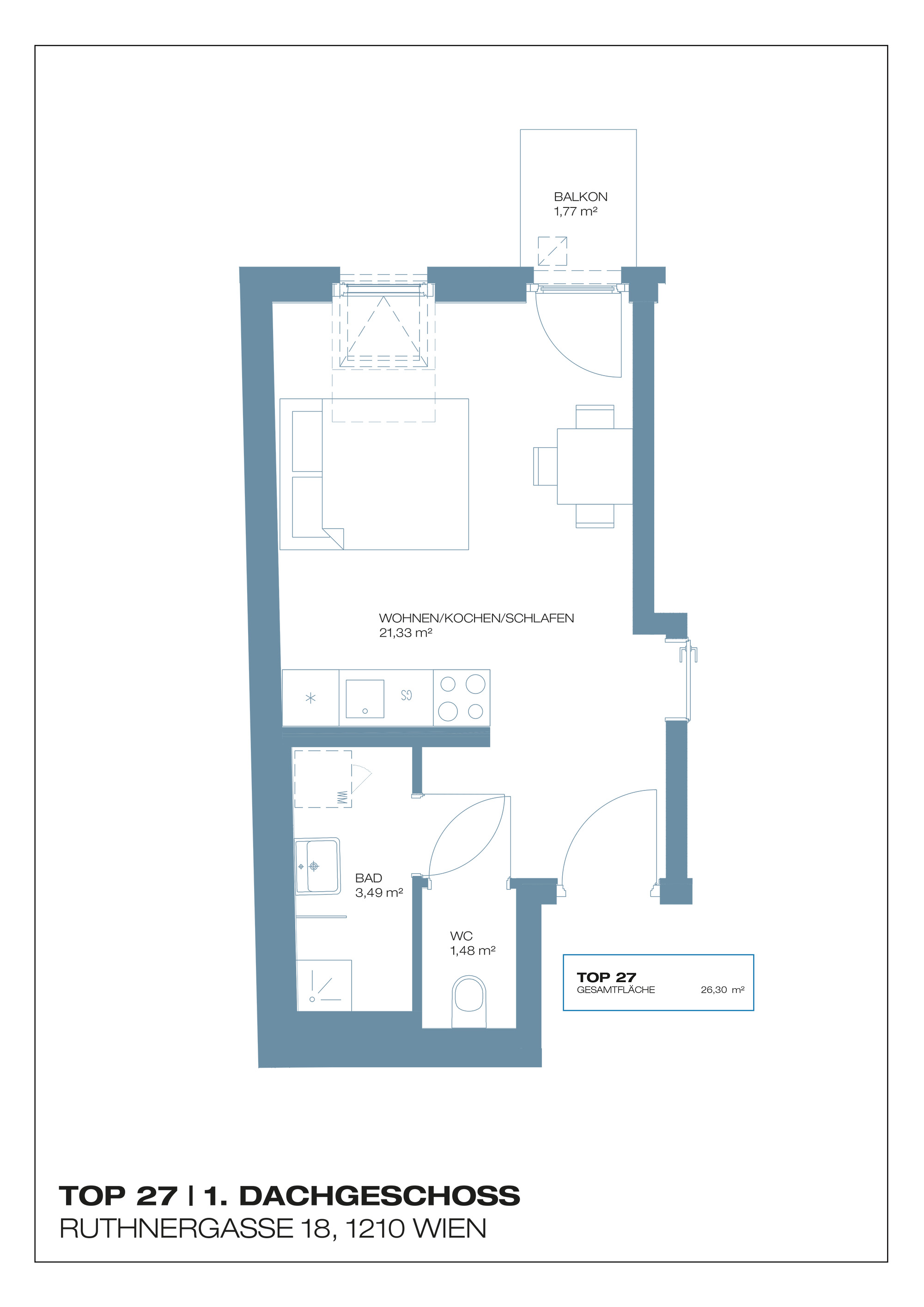 Ein gemütliches Apartment mit Balkon im Dachgeschoss. Die smarte Aufteilung ermöglicht eine vielseitige Nutzung der hellen Wohnräume.